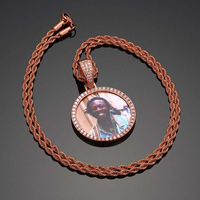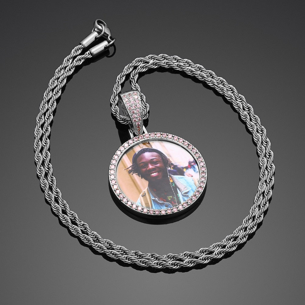 Pink Stone Custom Photo Medallion Necklace is the most loved new trend as it allows you to memorialize your favorite photo into a piece of jewelry you can wear every day. This custom Hip hop photo necklace specially designed for the hip hop lover. Photo Medallions necklace is the perfect backdrop for your favorite photo. Personalized necklace with your special moment is always the best gift for your loved ones.