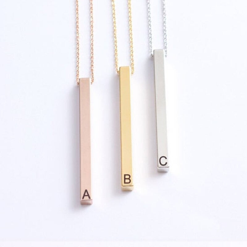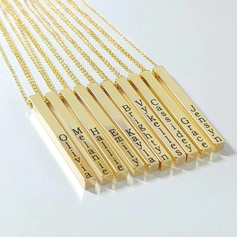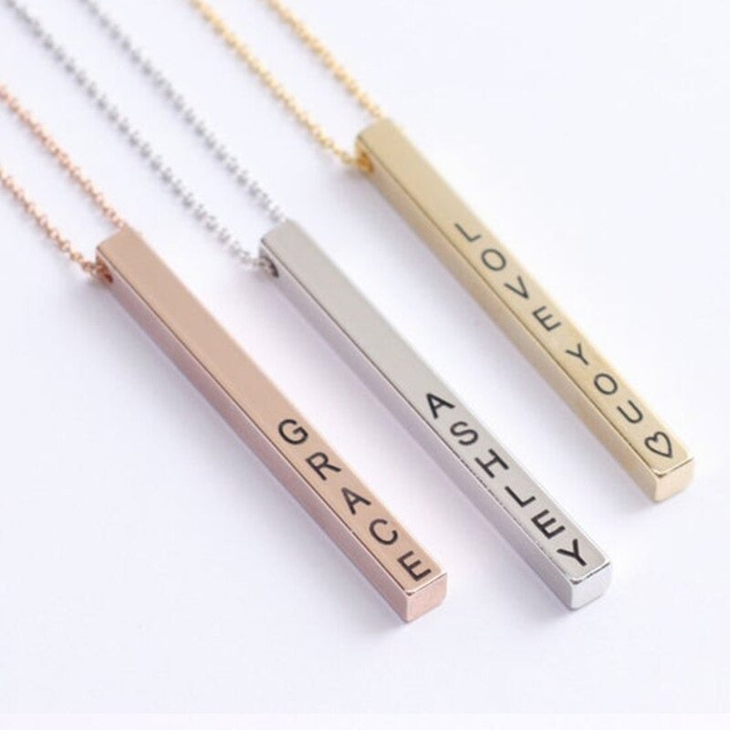 You can enhance your style with this personalized name bar necklace. This is a personalized vertical bar necklace. You can engrave four sides with this necklace which makes this necklace a special and meaningful gift. Our 4 Sided Bar can be personalized with a date, name, location, word, or phrase and up to 4 sides engraved. Two bar sizes to choose from: thick and thin.