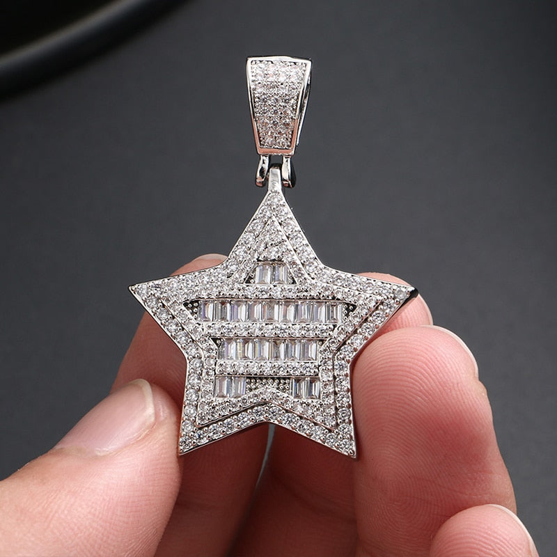 Men's luxury hip hop necklace chain specially designed for the hip hop lover. This Crystal Star Pendant Necklace makes it an excellent choice of material for a gift. The hip hop necklace is made of high-quality zinc alloy, solid and durable, free of lead and nickel, healthy and safe.