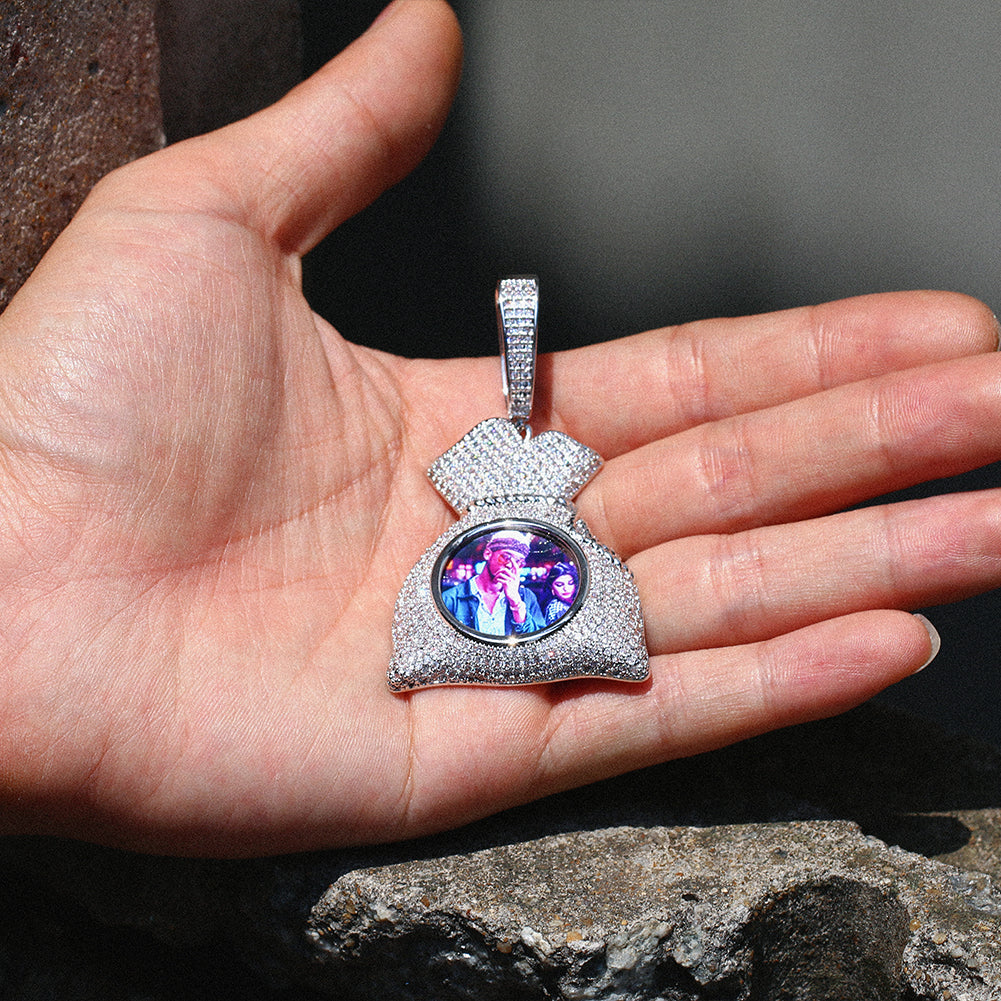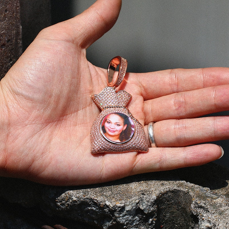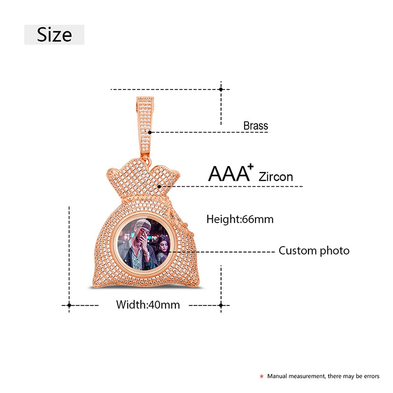 Package Includes:Ā 1pc Custom 18k Gold Money Bag Pendant Photo Medallion Necklace