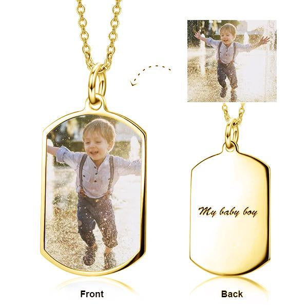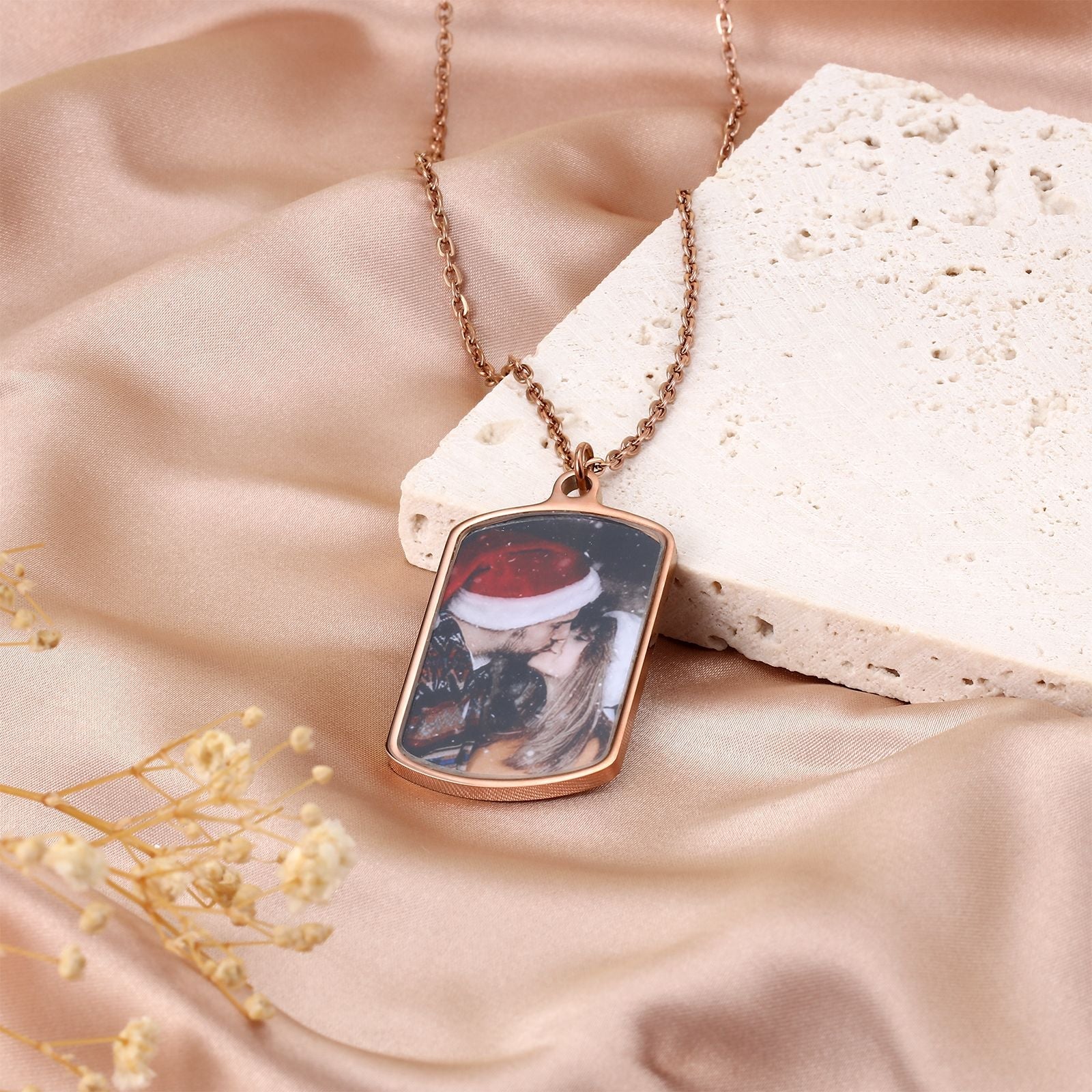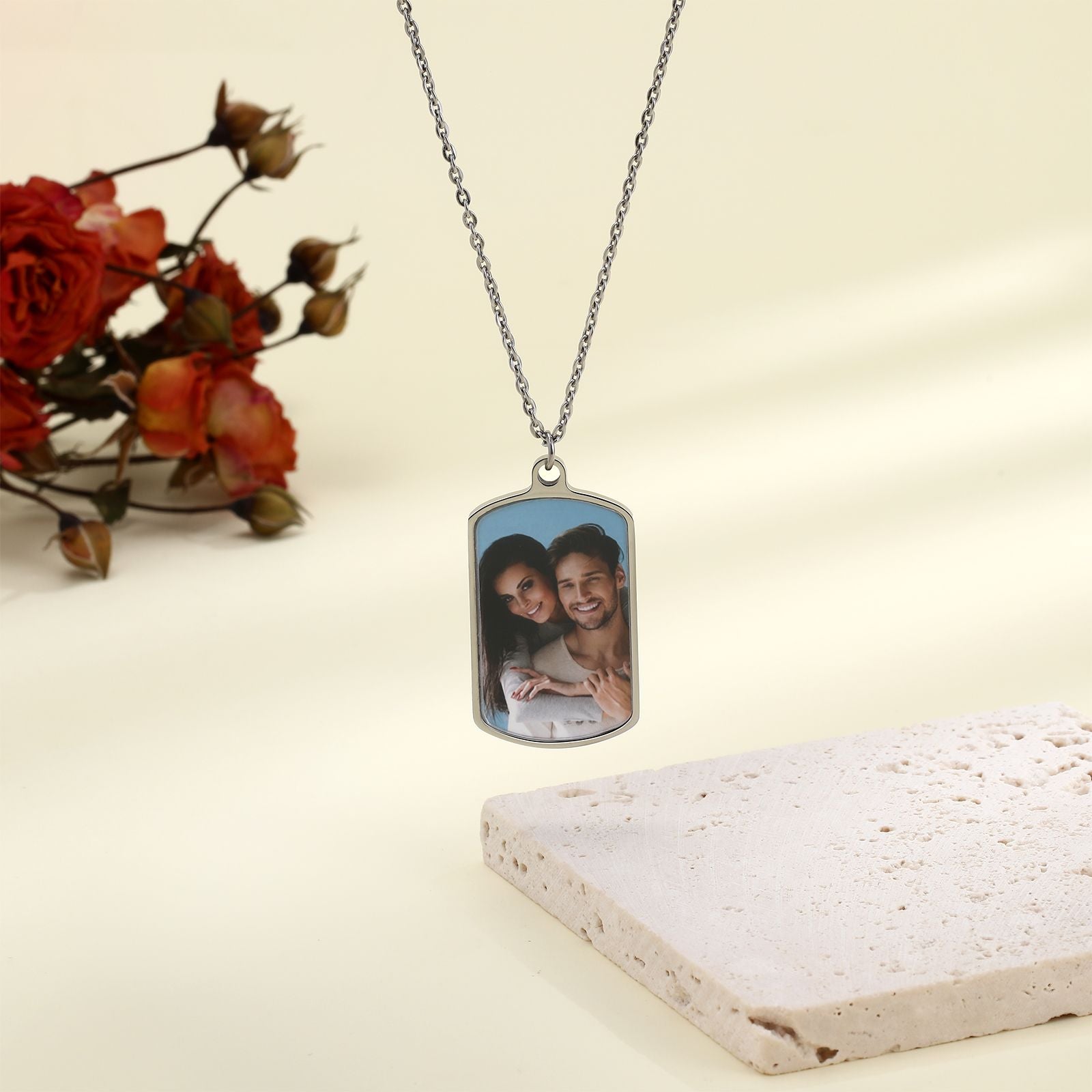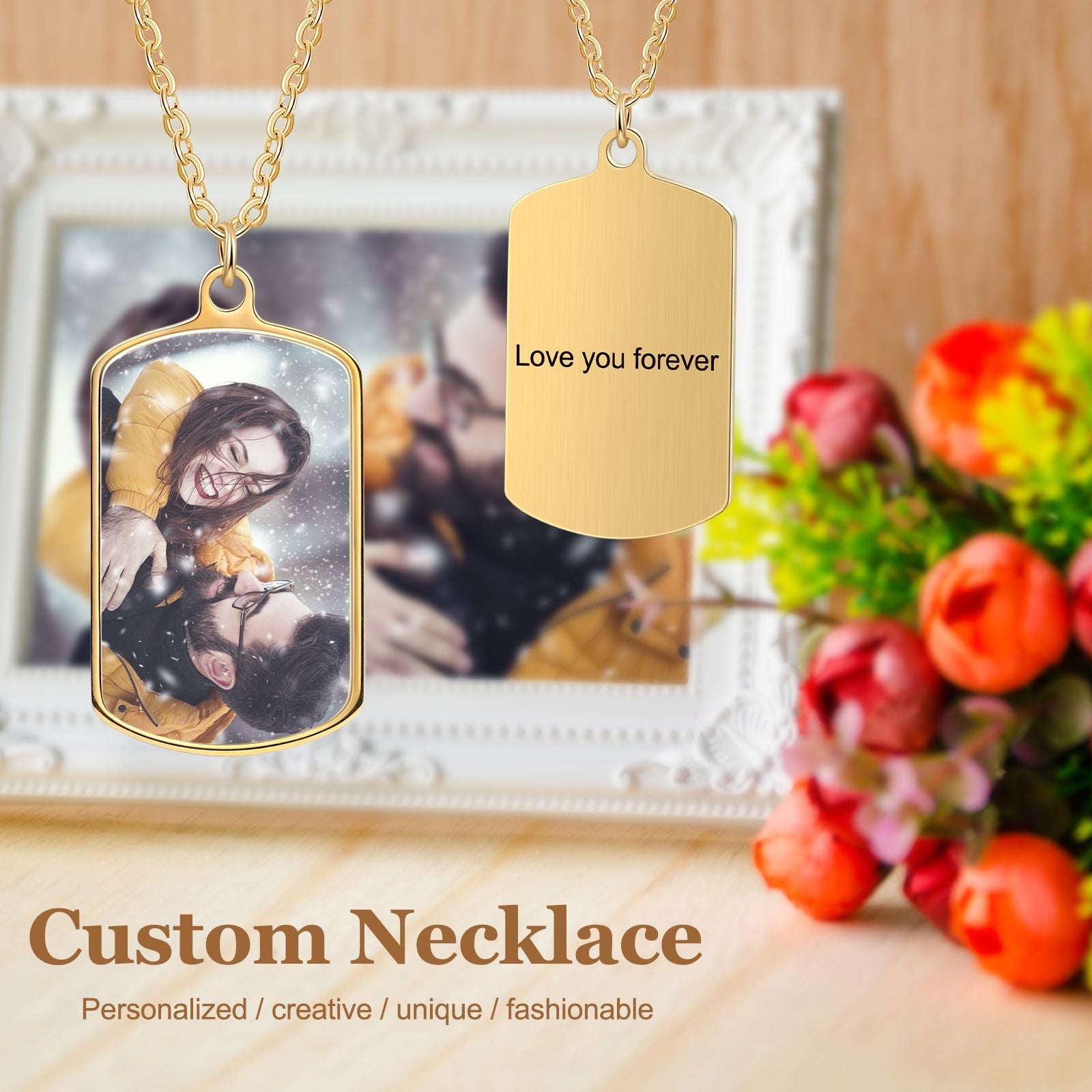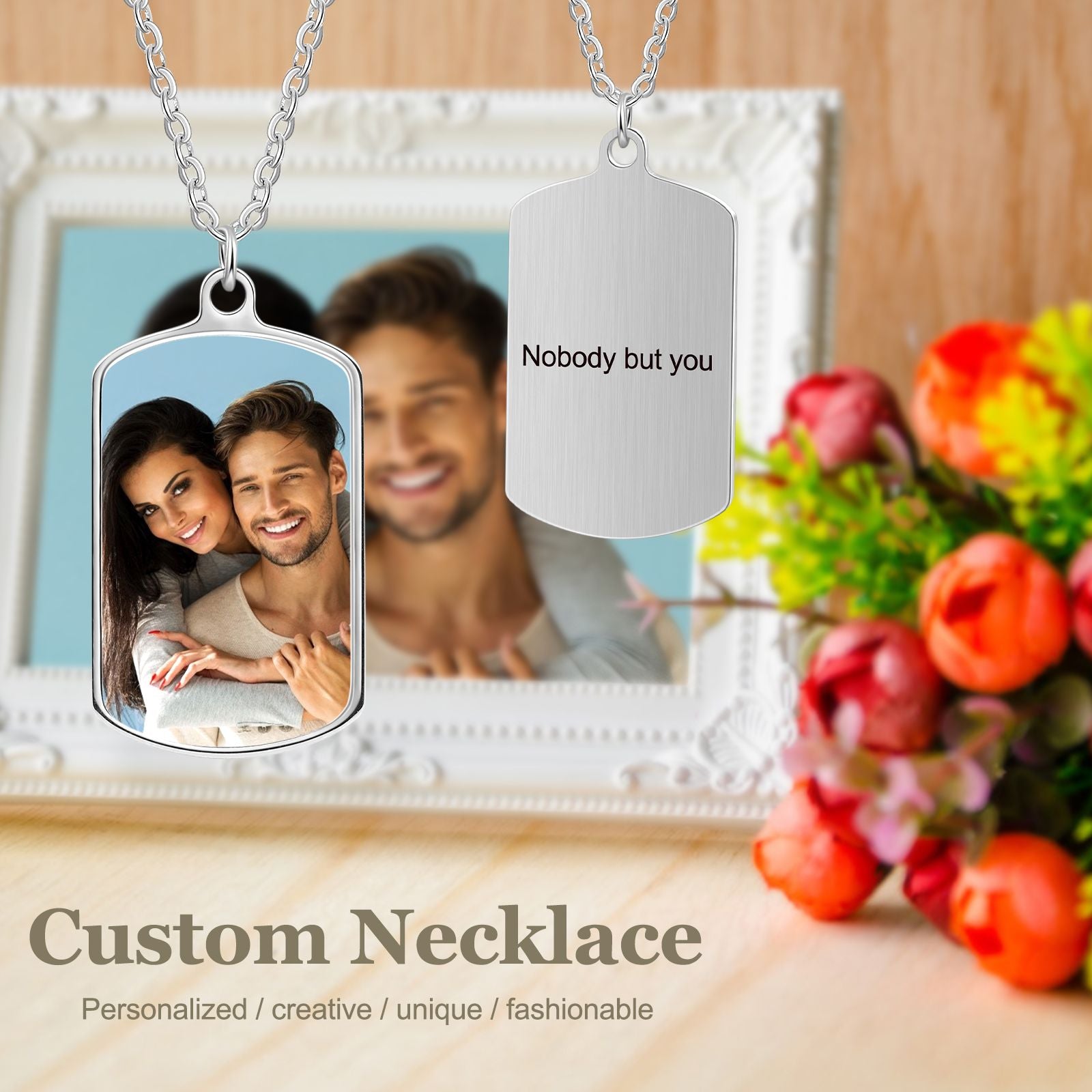 Have a beautiful or meaningful photo engraved into a necklace. The Custom Dog Tag Photo Necklace can be added to your photo on the front side, and it can be engraved in letters on the backside. This unique photo necklace is carefully constructed of Hypoallergenic, lead, and nickel-free. This custom, unique necklace is great for many occasions.