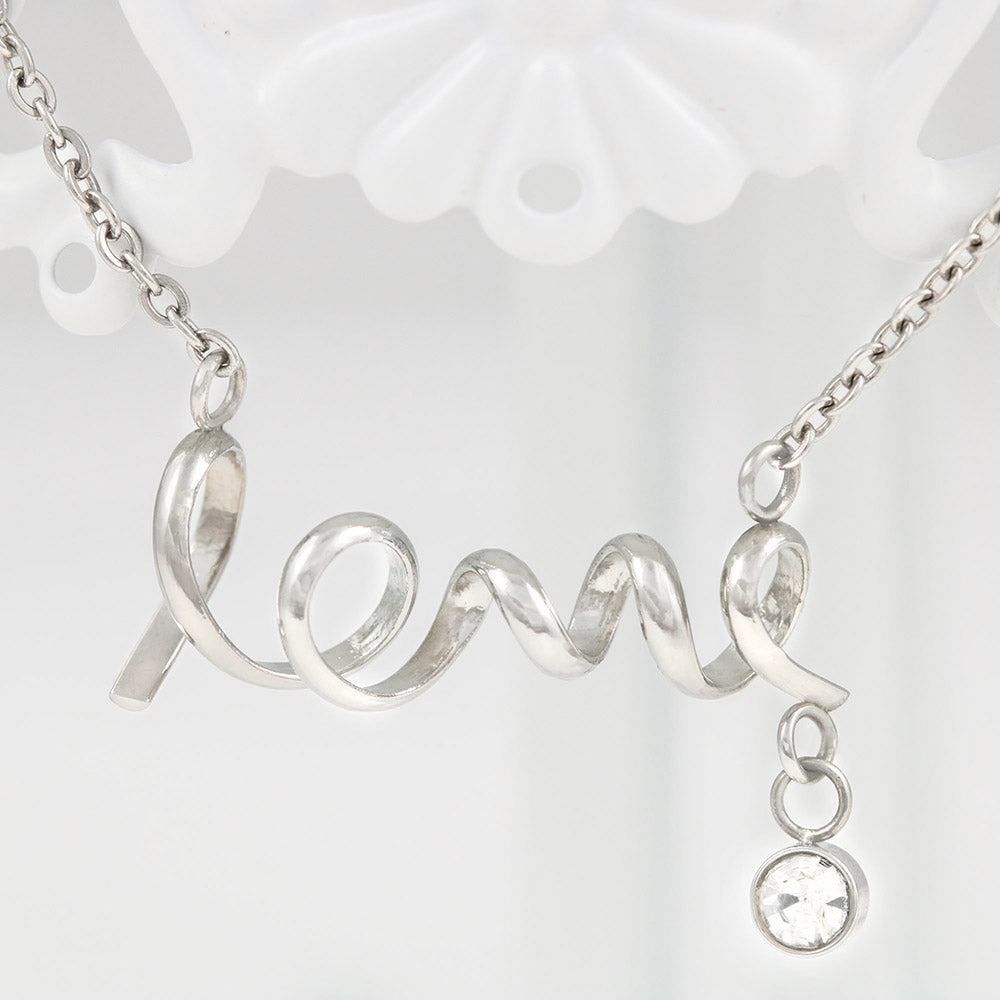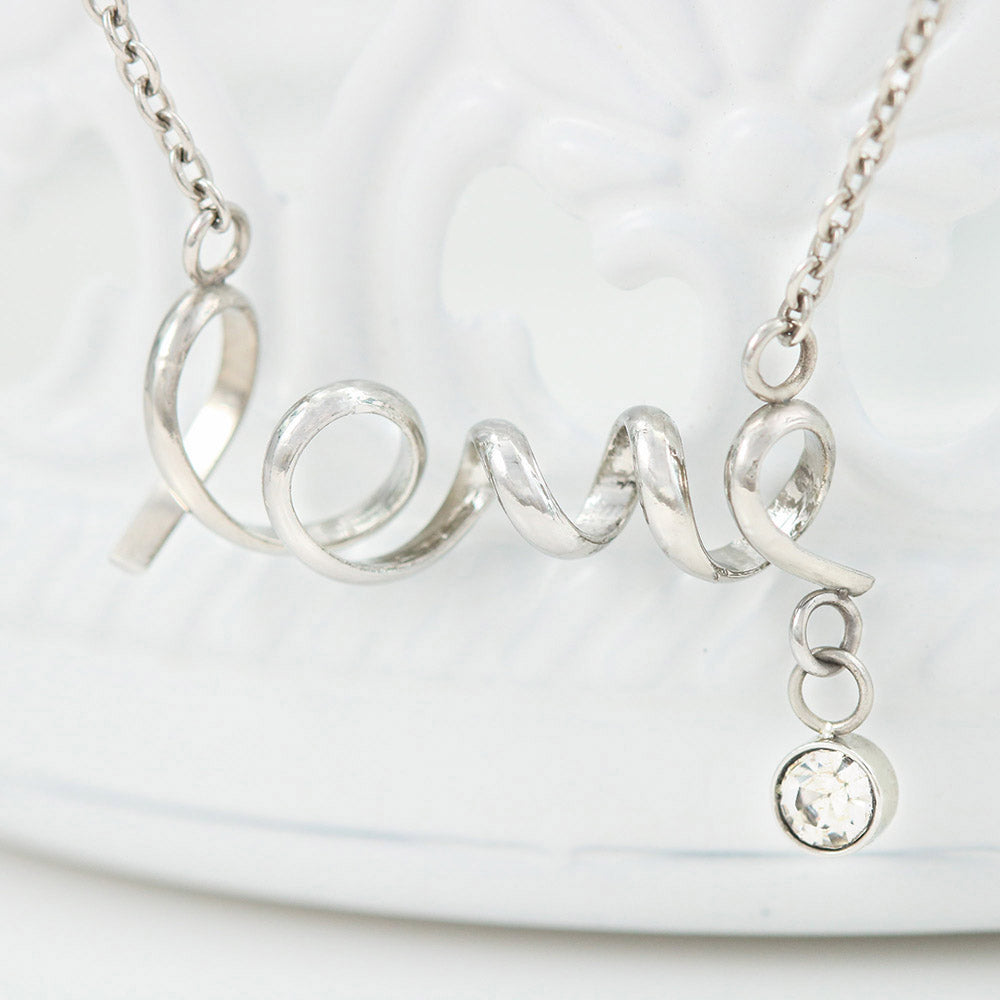 This dainty polished necklace leaves no doubt in her mind about your true feelings. Created in cool surgical steel, this adorable design spells out the word "love" in a playful cursive font. Embellished with a Cubic Zirconia attachment and a brilliant polished shine, this sweet style suspends centered along a 16 to 22-inch adjustable cable chain that secures perfectly with a lobster clasp.