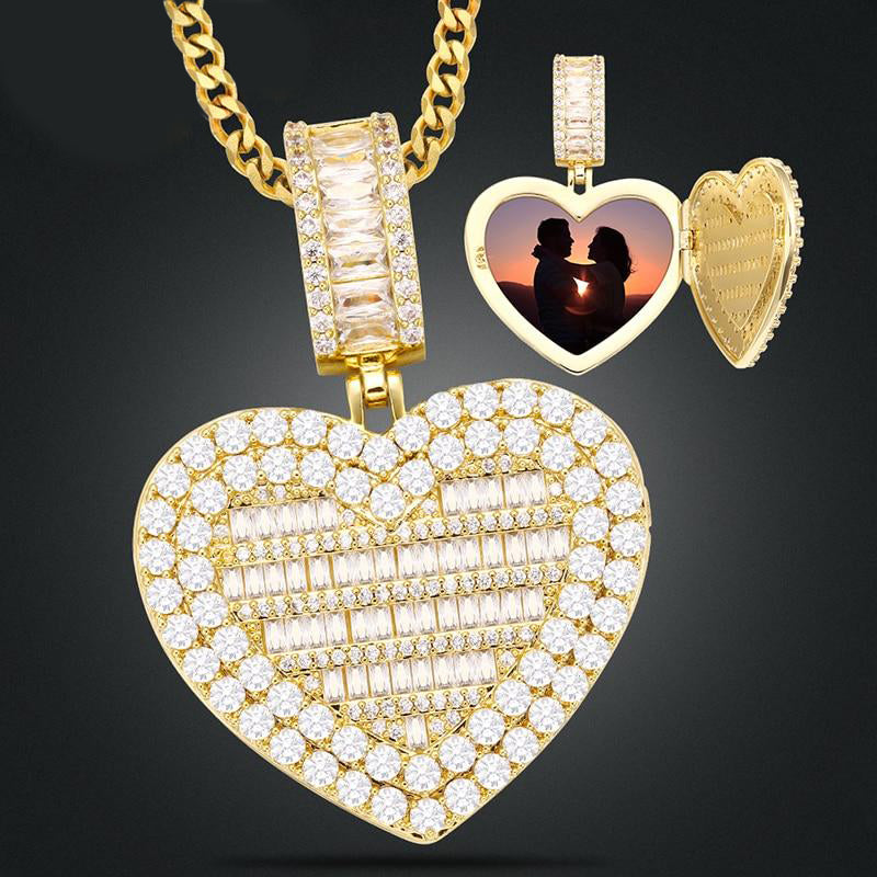 Micro Pave Cubic Zircon Heart Photo Medallion Necklace- Hip Hop Locket Pendant Necklace For Girls