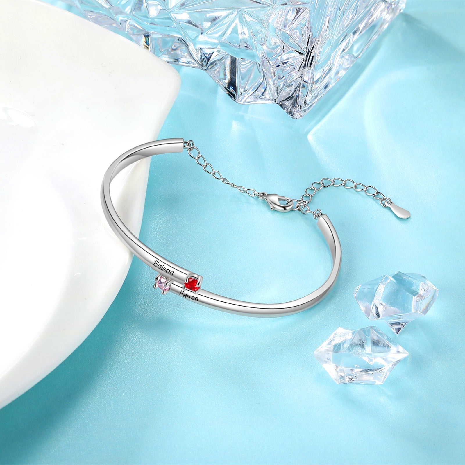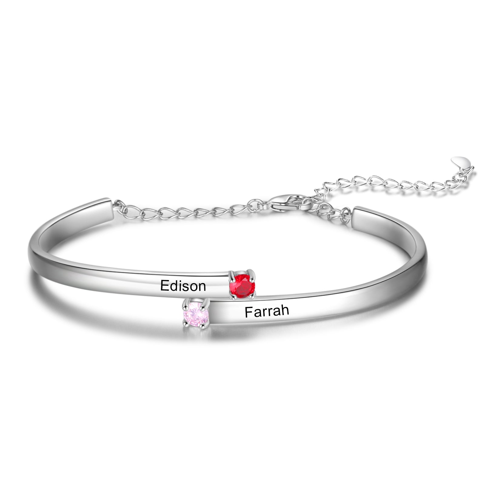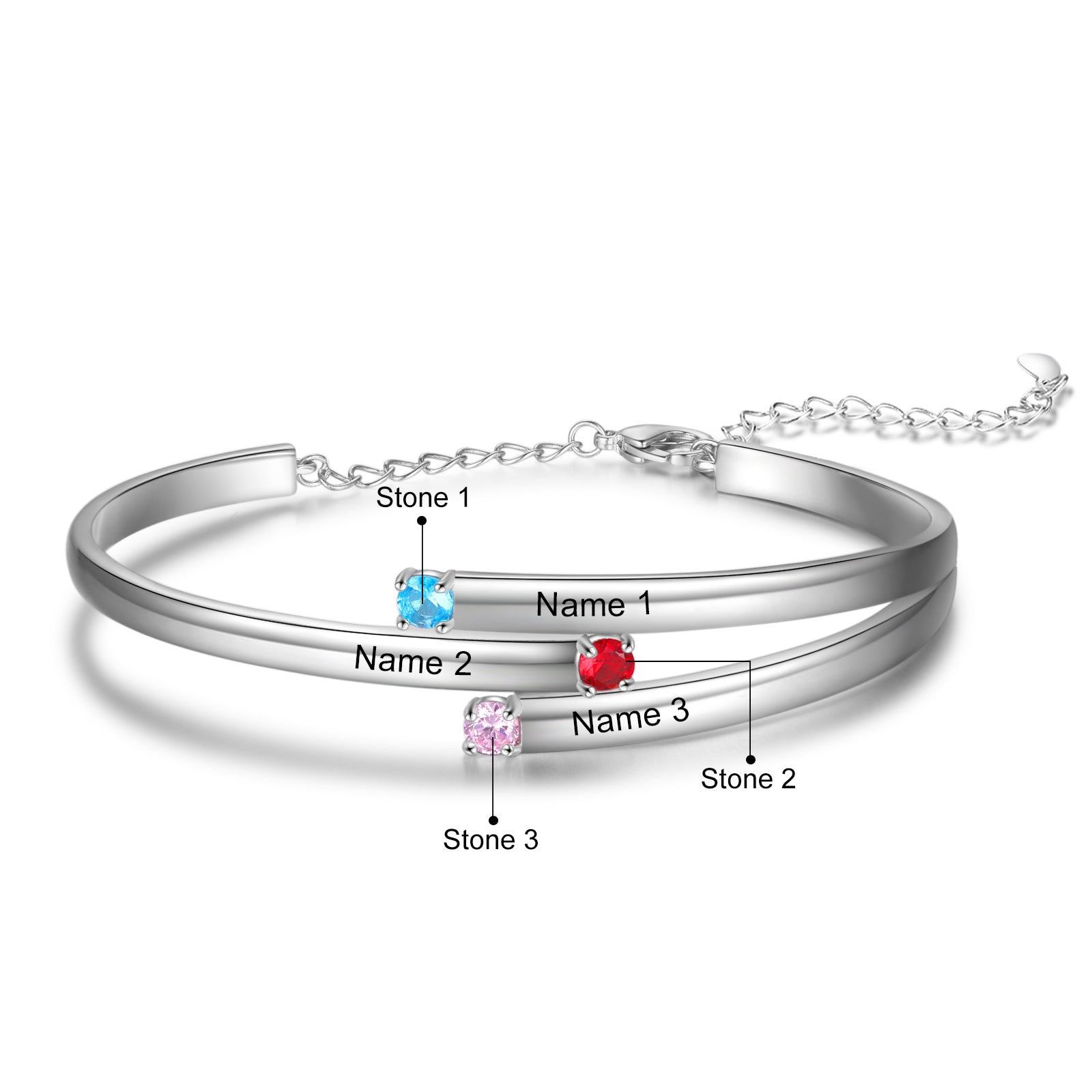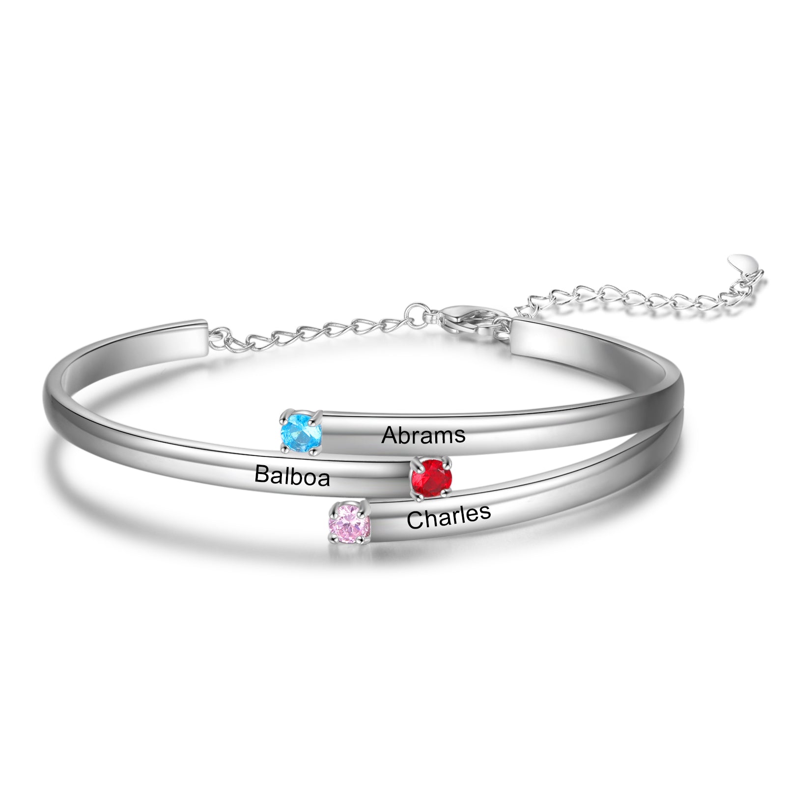 EngravedGiftsly presents Brand New "Custom Names Bangle Bracelet For Women" is one of the unique bracelets you can buy for women. This bangle bracelet is allowing you to custom up to 3 names on it, you can have the bracelet without customization in addition. You can make it unique by your own style like leave couple names and select marriage month for both stones.