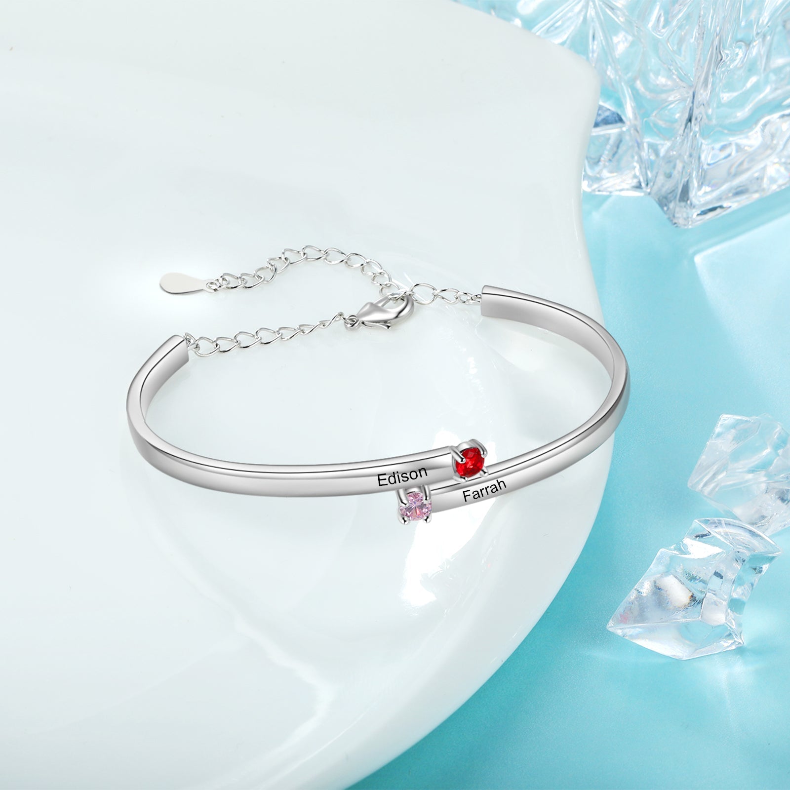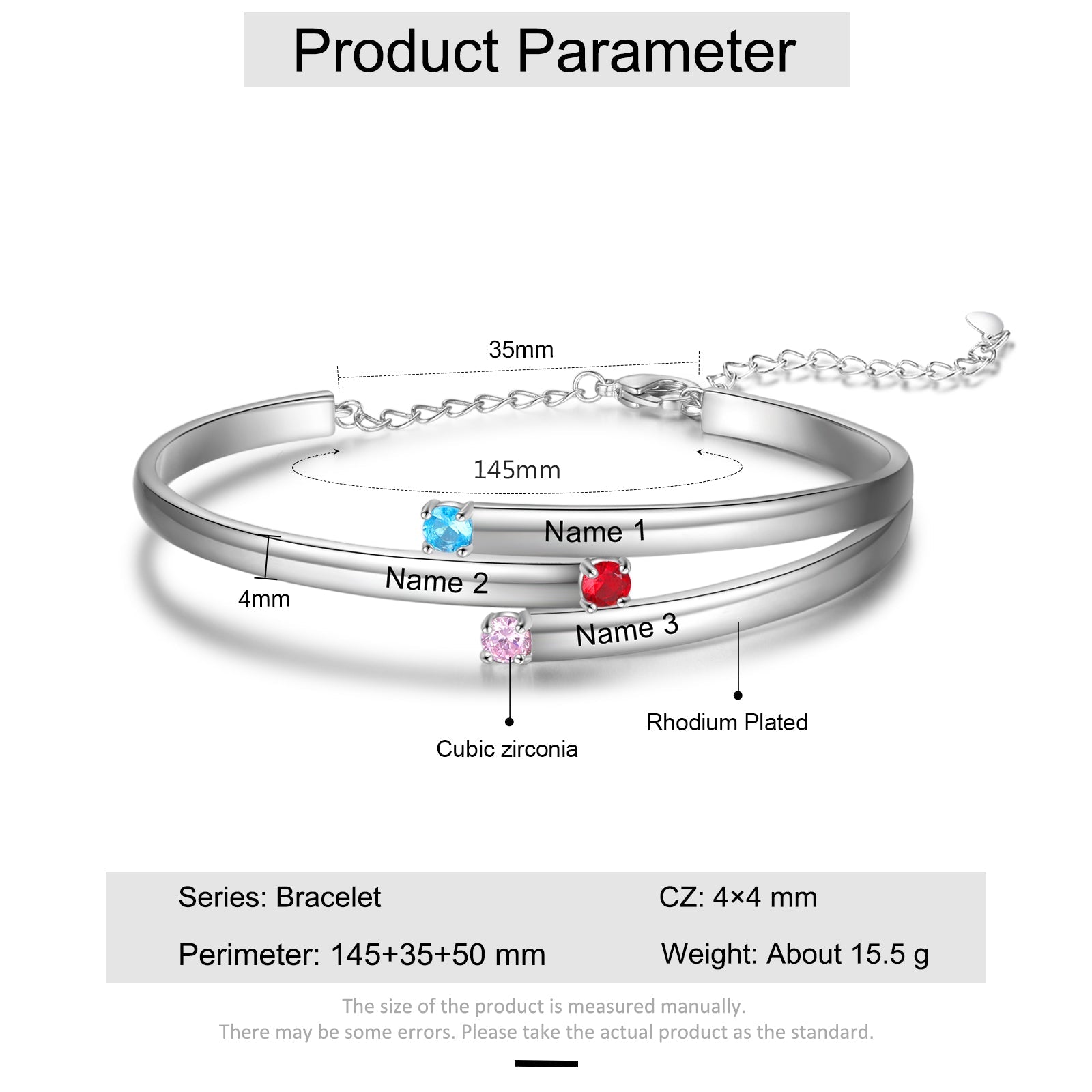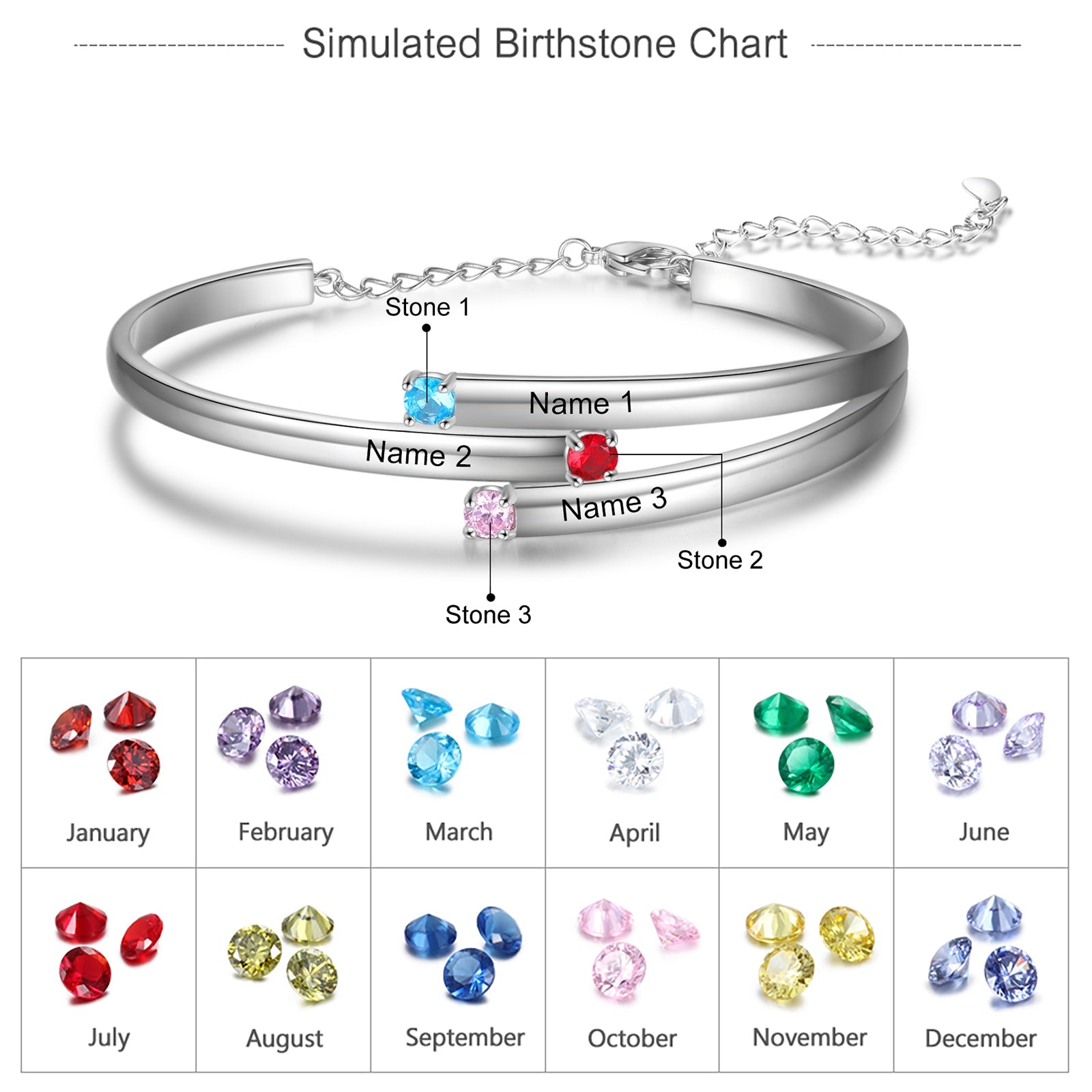 EngravedGiftsly presents Brand New "Custom Names Bangle Bracelet For Women" is one of the unique bracelets you can buy for women. This bangle bracelet is allowing you to custom up to 3 names on it, you can have the bracelet without customization in addition. You can make it unique by your own style like leave couple names and select marriage month for both stones.