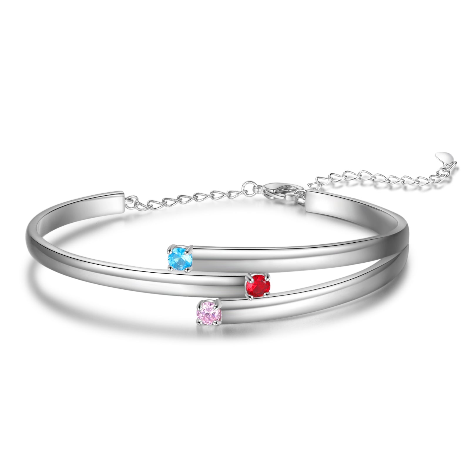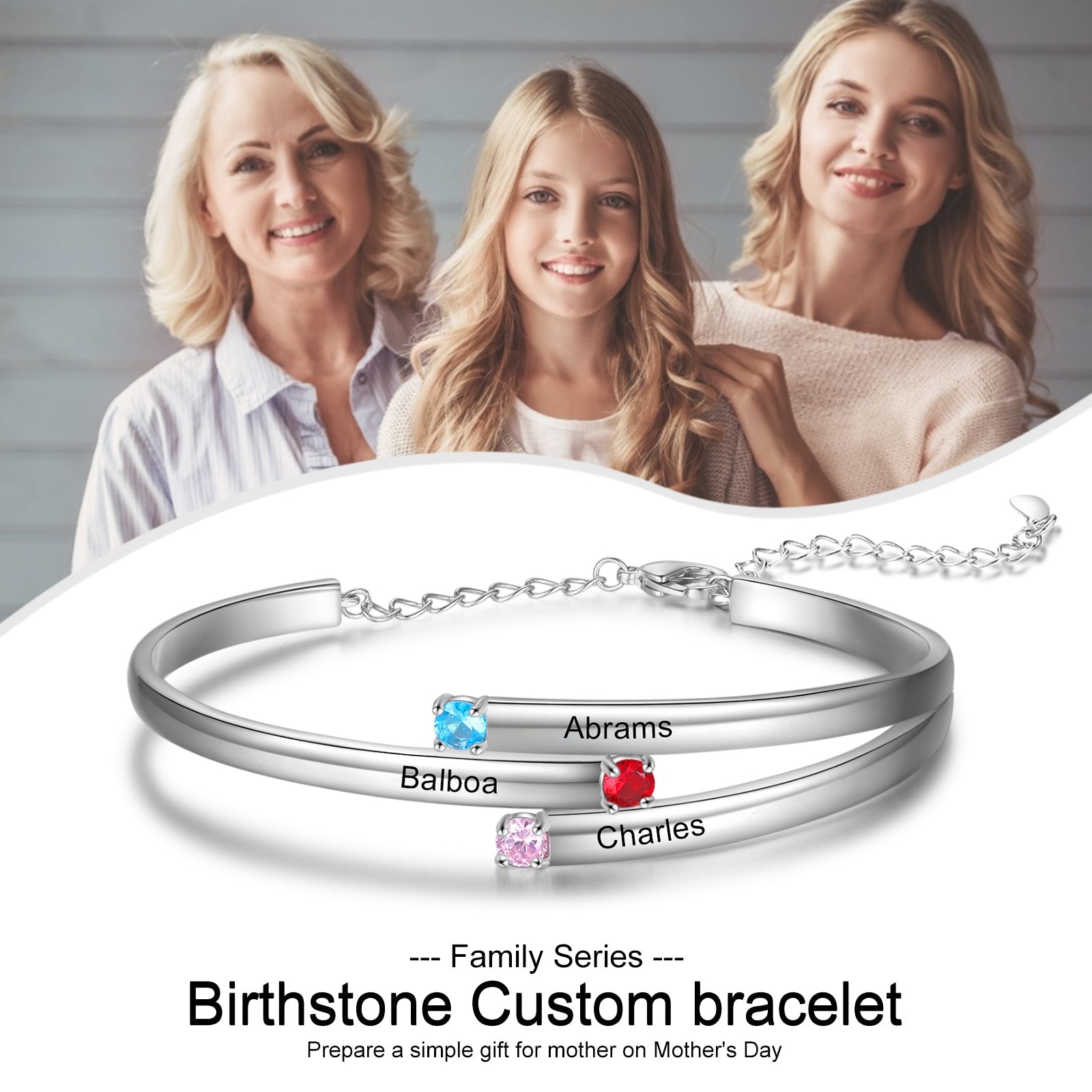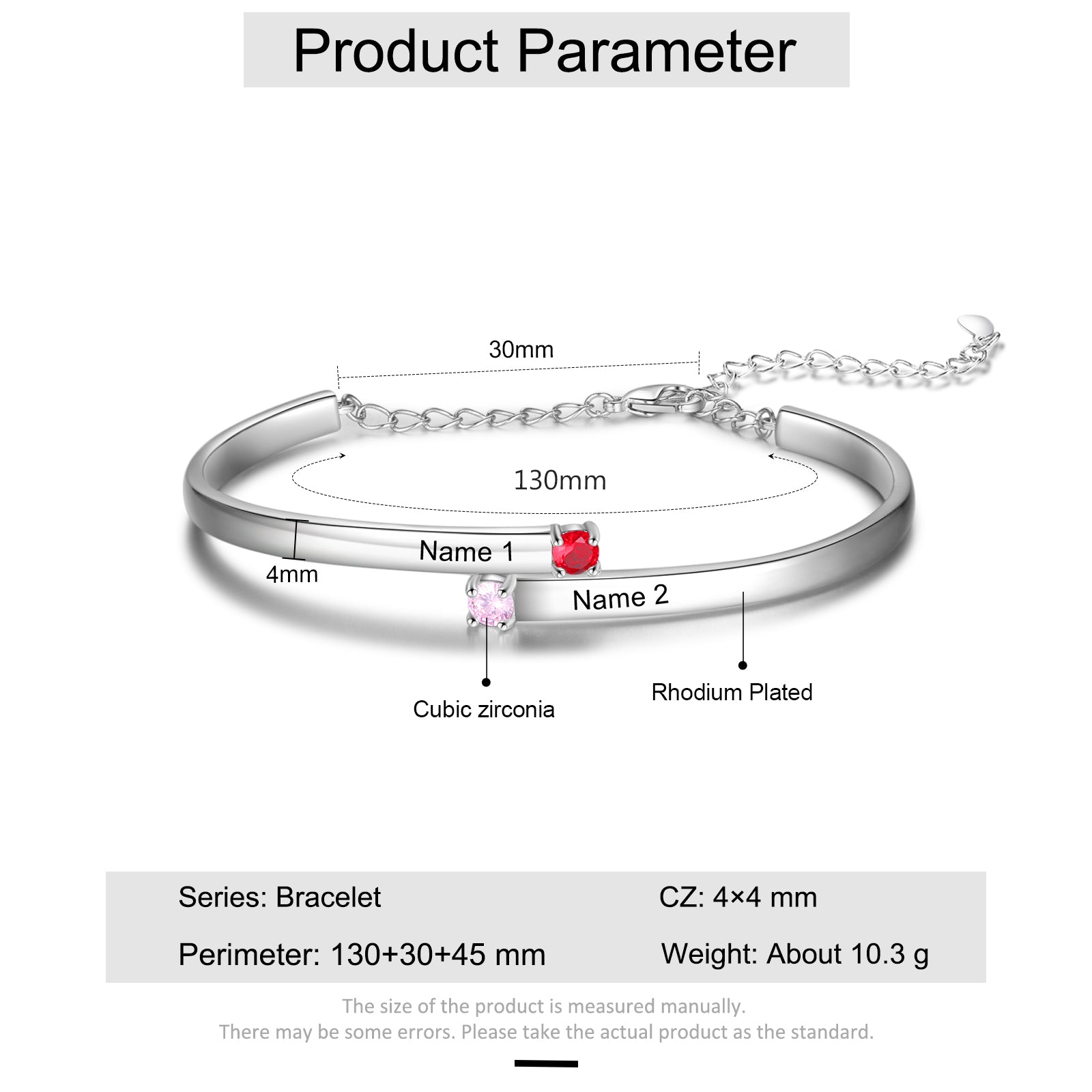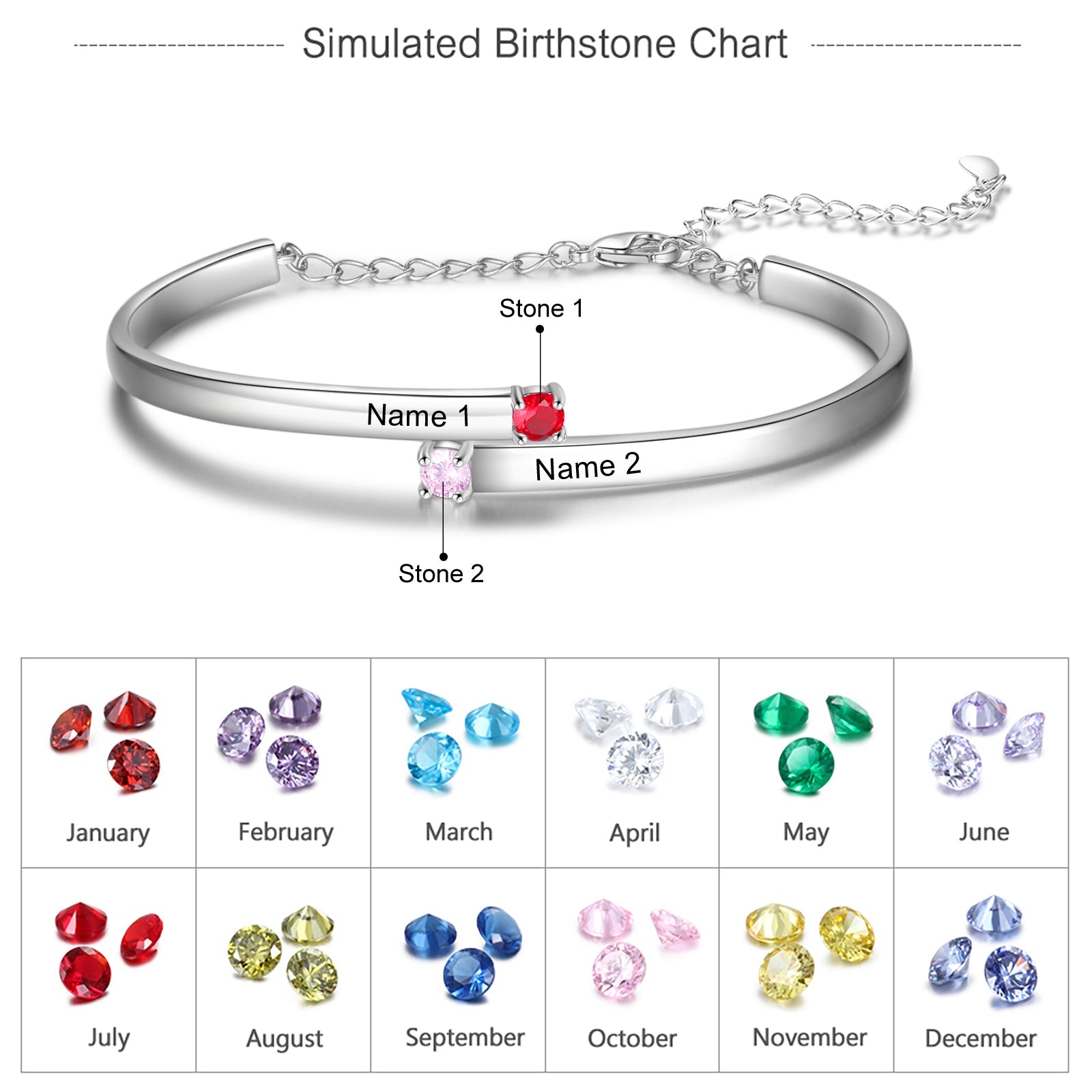 EngravedGiftsly presents Brand New "Custom Names Bangle Bracelet For Women" is one of the unique bracelets you can buy for women. This bangle bracelet is allowing you to custom up to 3 names on it, you can have the bracelet without customization in addition. You can make it unique by your own style like leave couple names and select marriage month for both stones.