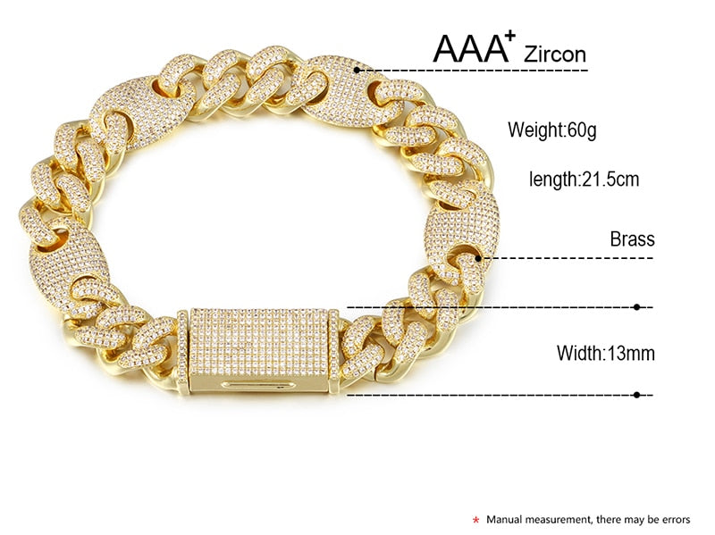 Fully iced bling rhinestone decoration of this 13mm Iced Out AAA CZ Crystal Cuban Chain Miami Link Bracelet. Excellent electrolysis surface treatment, shiny and frosted appearance and durable. It is a good gift for your lovers, friends, families and coworkers. This elegant piece will definitely set you apart from the rest.