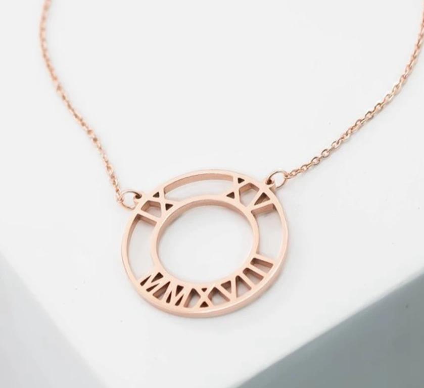 Our personalized Roman Numeral circle necklace is the perfect gift for remembering a significant date in your life. A simple but gorgeous necklace pendant that can add different looks to you Whether you would like to personalize this with an anniversary date or a birth date, this personalized necklace makes for an elegant and meaningful piece.