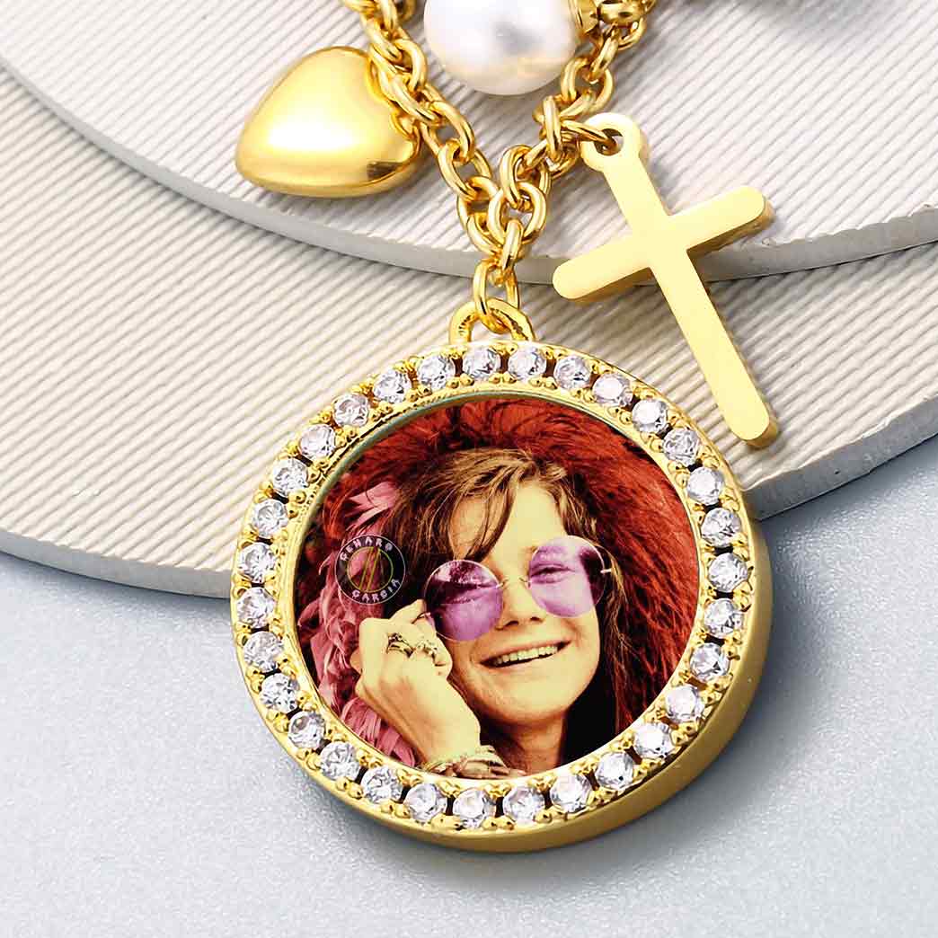 If you've been looking for a unique and special gift, you've just found it. This "Custom Medallion Photo Bracelet With Heart Charm White Pearl and Cross" is coated in a special anti-tarnish polish that preserves its luster and shines for a long. The Photo charm hanging loosely on the bracelet gives it an exhilarating appeal. A unique slide clasp allows the bracelet to adjust to the perfect fit.