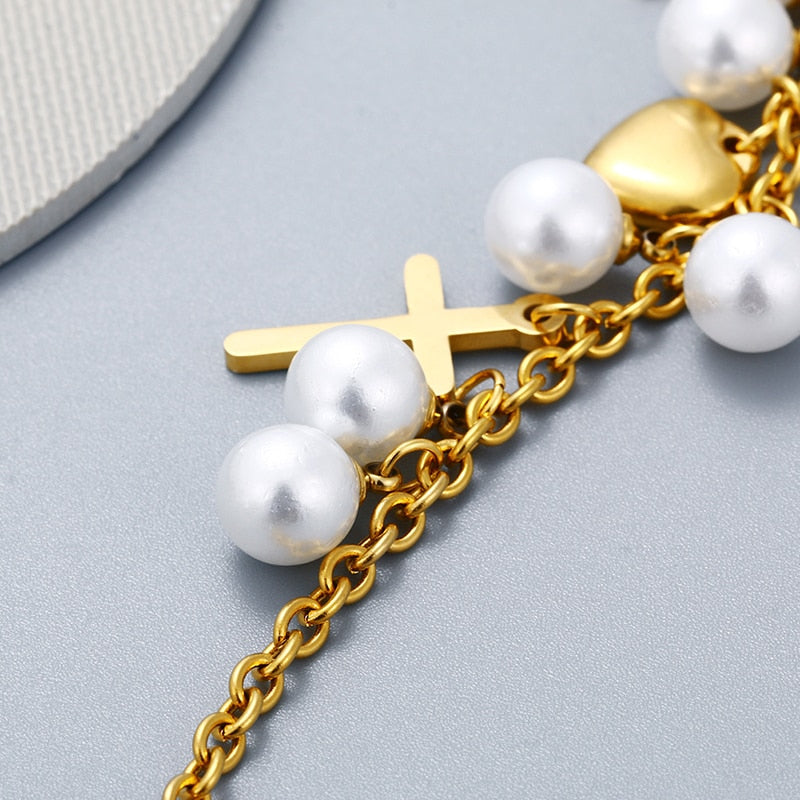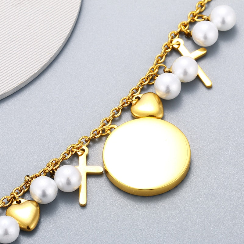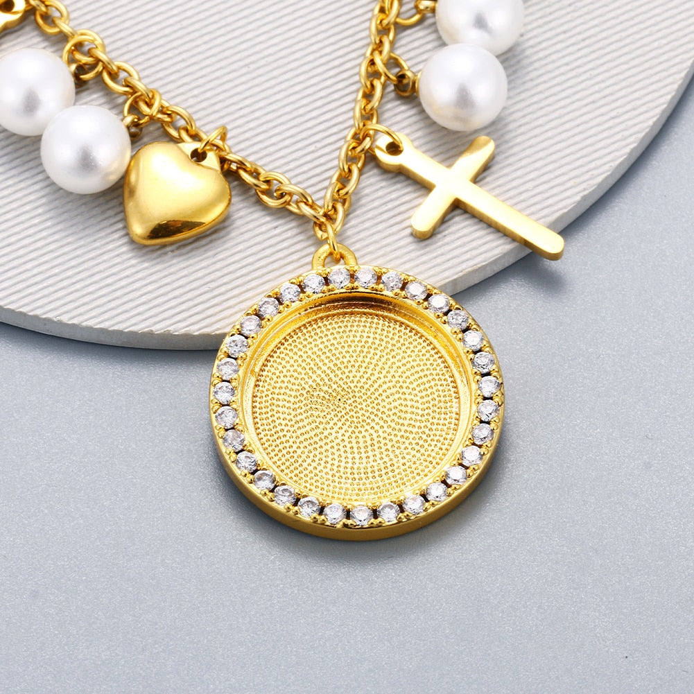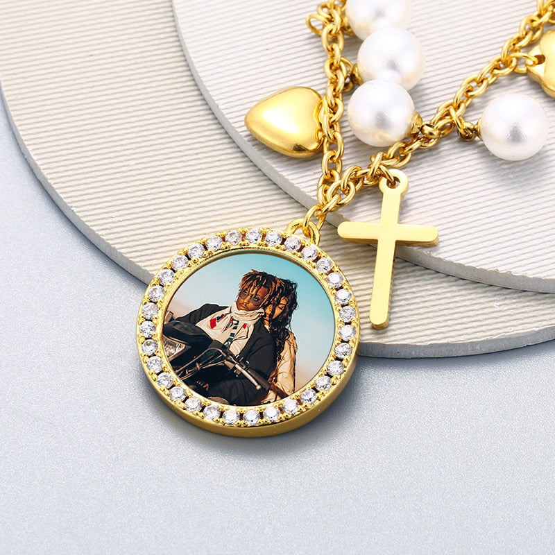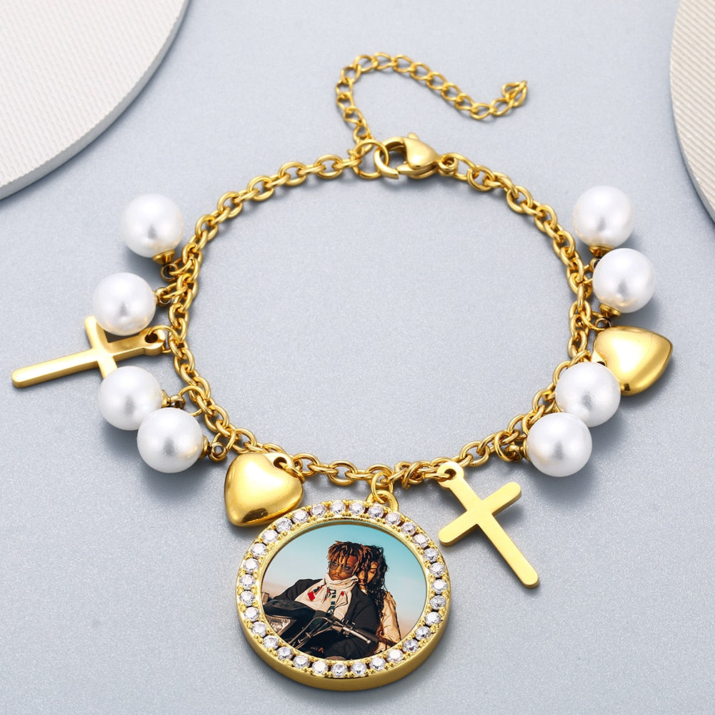 Package Includes: 1Pcs Custom Medallion Photo Bracelet With Heart Charm White Pearl and Cross