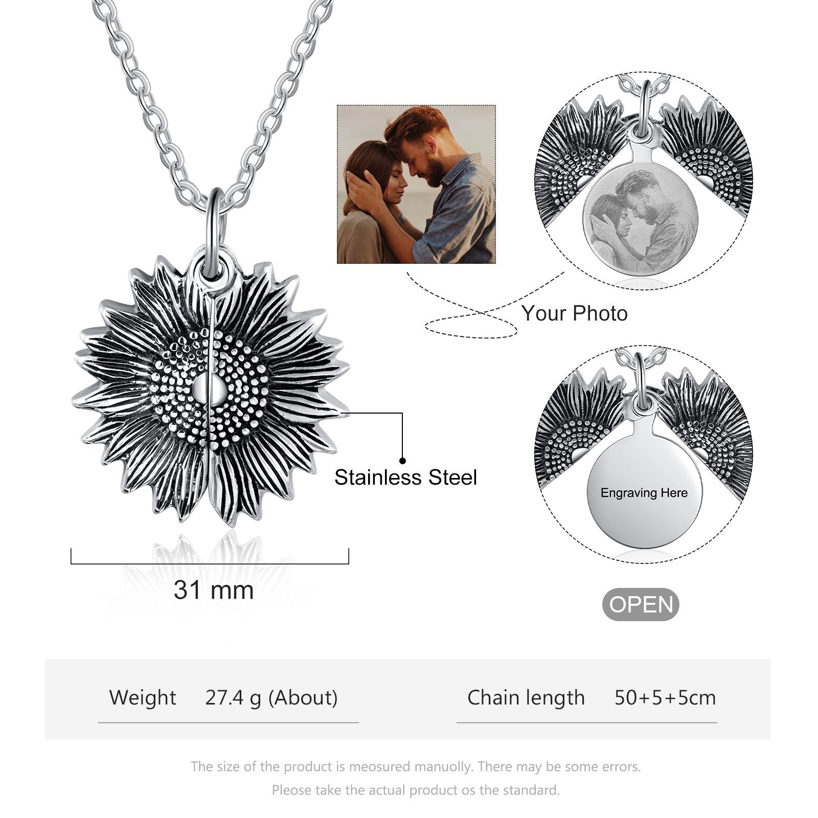 Capture the special moment and customize it into an everlasting custom sunflower necklace. Your pendant will accompany back engraving with your custom words, date, or symbol. Which is a perfect piece of personalized photo jewelry that makes you special and shows your personality.