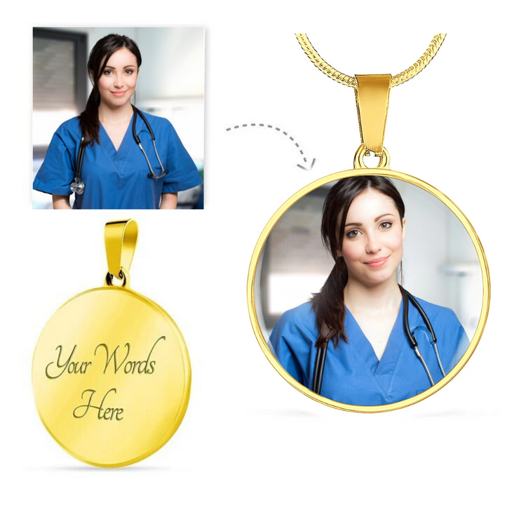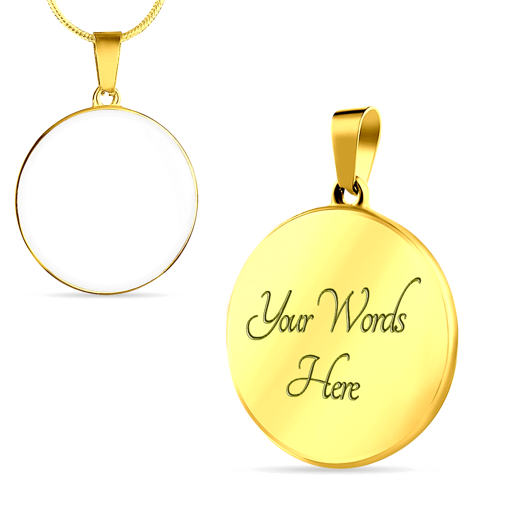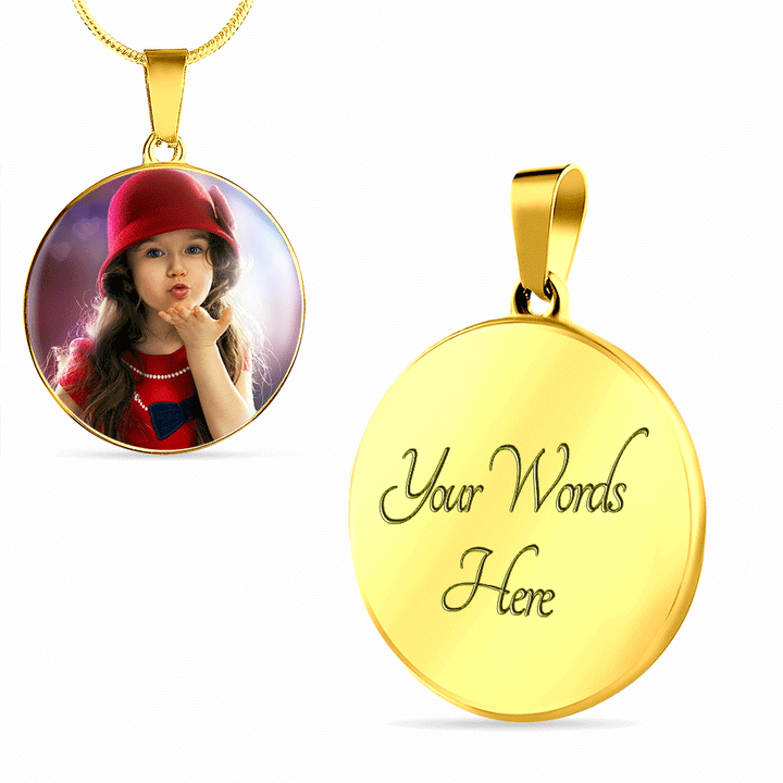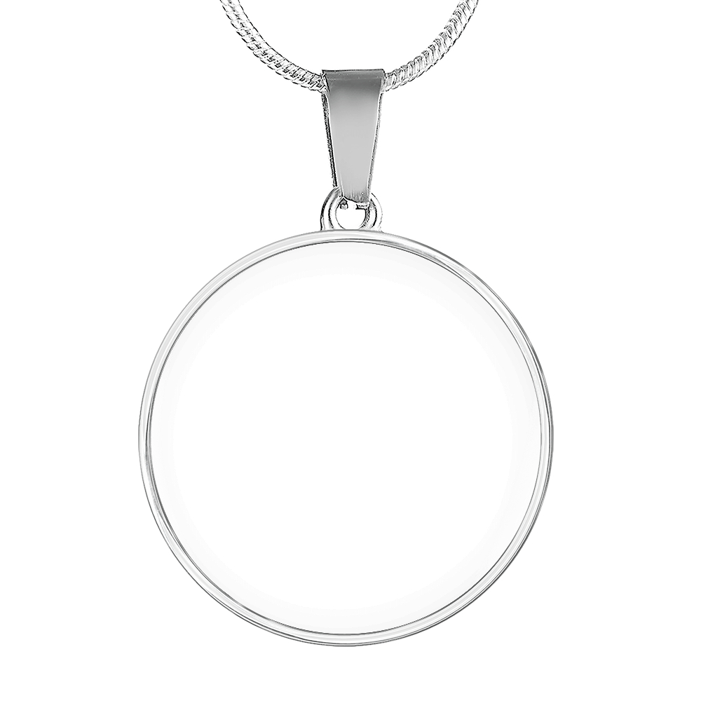 Our personalized circle pendant necklace is made of high-quality surgical steel with a shatterproof liquid glass coating and an 18k gold finish option.