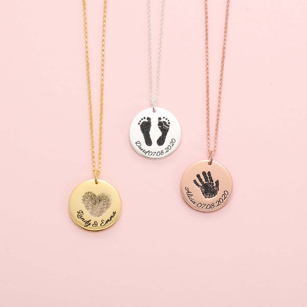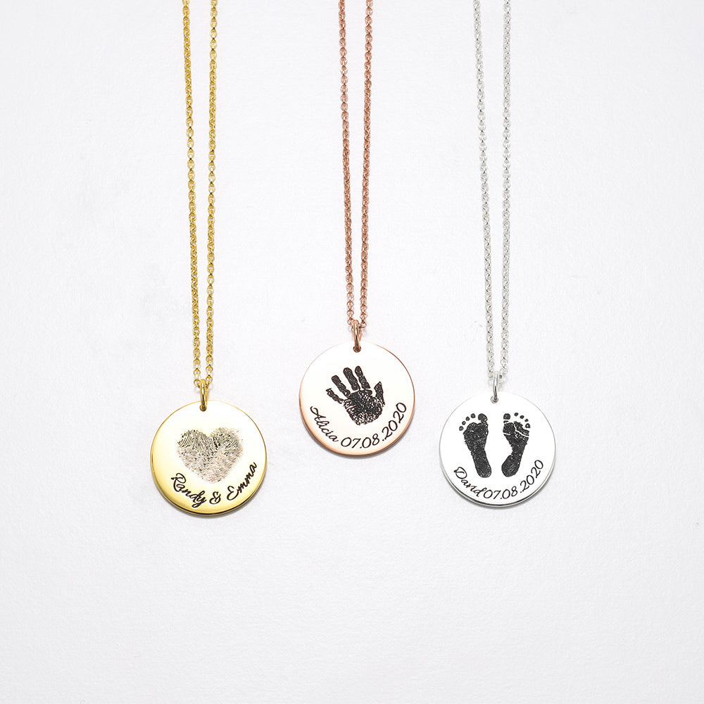 Our 18k Gold Plated Fingerprint Round Necklace offers a beautiful and unique look. On the Upper side of the pendant we will engrave a fingerprint. On the down side we engrave the name, Date or word you prefer. When finished, the look is both balanced and beautiful! The fingerprint is the most unique and confidential symbol of a person in the world. Making a piece of jewelry with him shows how special he is in your heart.