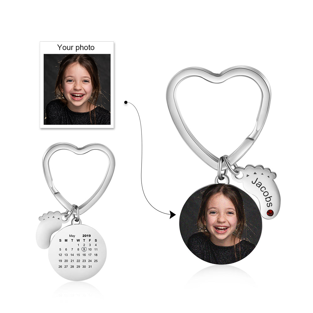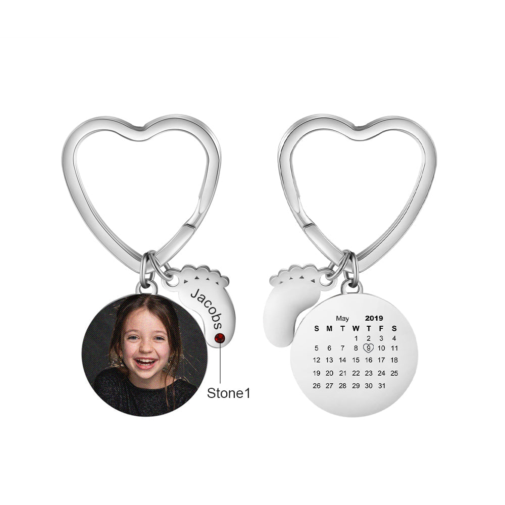 One of the cutest ways to show off your baby is to use our Customized Photo Keychain with Calendar & Birthstone baby Feet. Everyone likes personalized photo jewelry, this personalized photo keychain provides a unique personal style. You can also choose a stone crystal And a Calendar to give it something special. This keychain with engraved baby Feet is a great gift for any mother!