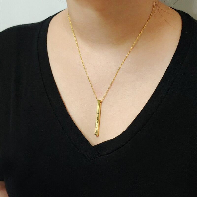 You can enhance your style with this personalized name bar necklace. This is a personalized vertical bar necklace. You can engrave four sides with this necklace which makes this necklace a special and meaningful gift. Our 4 Sided Bar can be personalized with a date, name, location, word, or phrase and up to 4 sides engraved. Two bar sizes to choose from: thick and thin.
