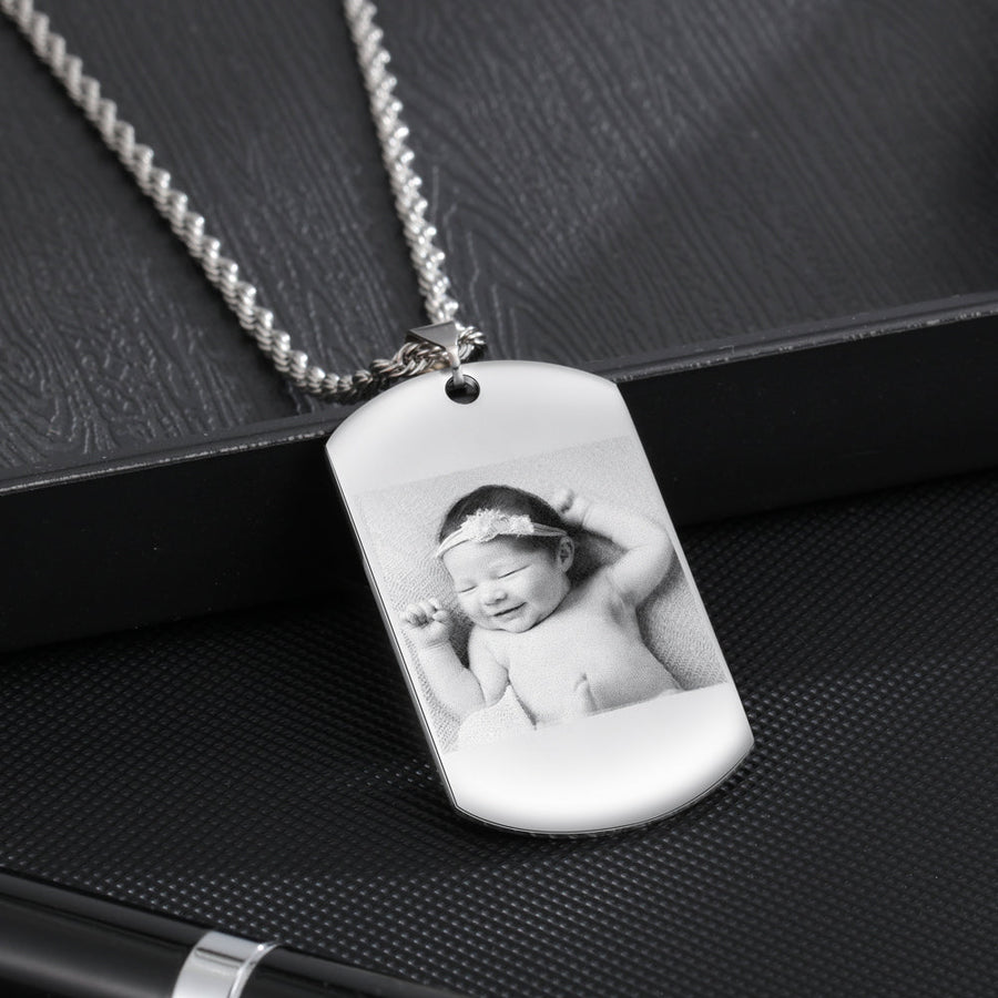 Capture the special moment and customize it into an everlasting custom photo dog tag necklace. Your pendant will accompany back engraving with your custom words, date, or symbol. Which is a perfect piece of personalized jewelry that makes you special and shows your personality.
